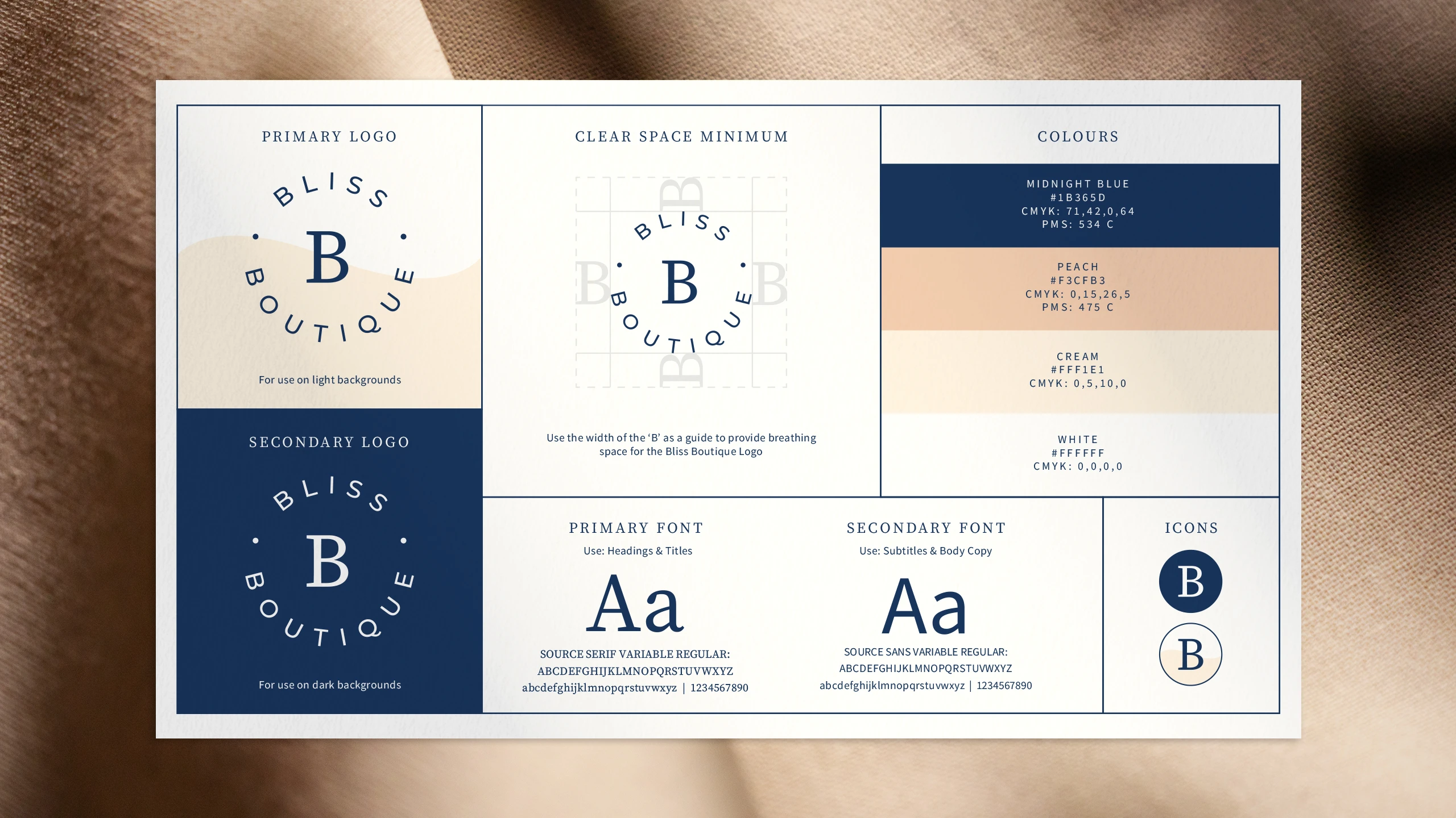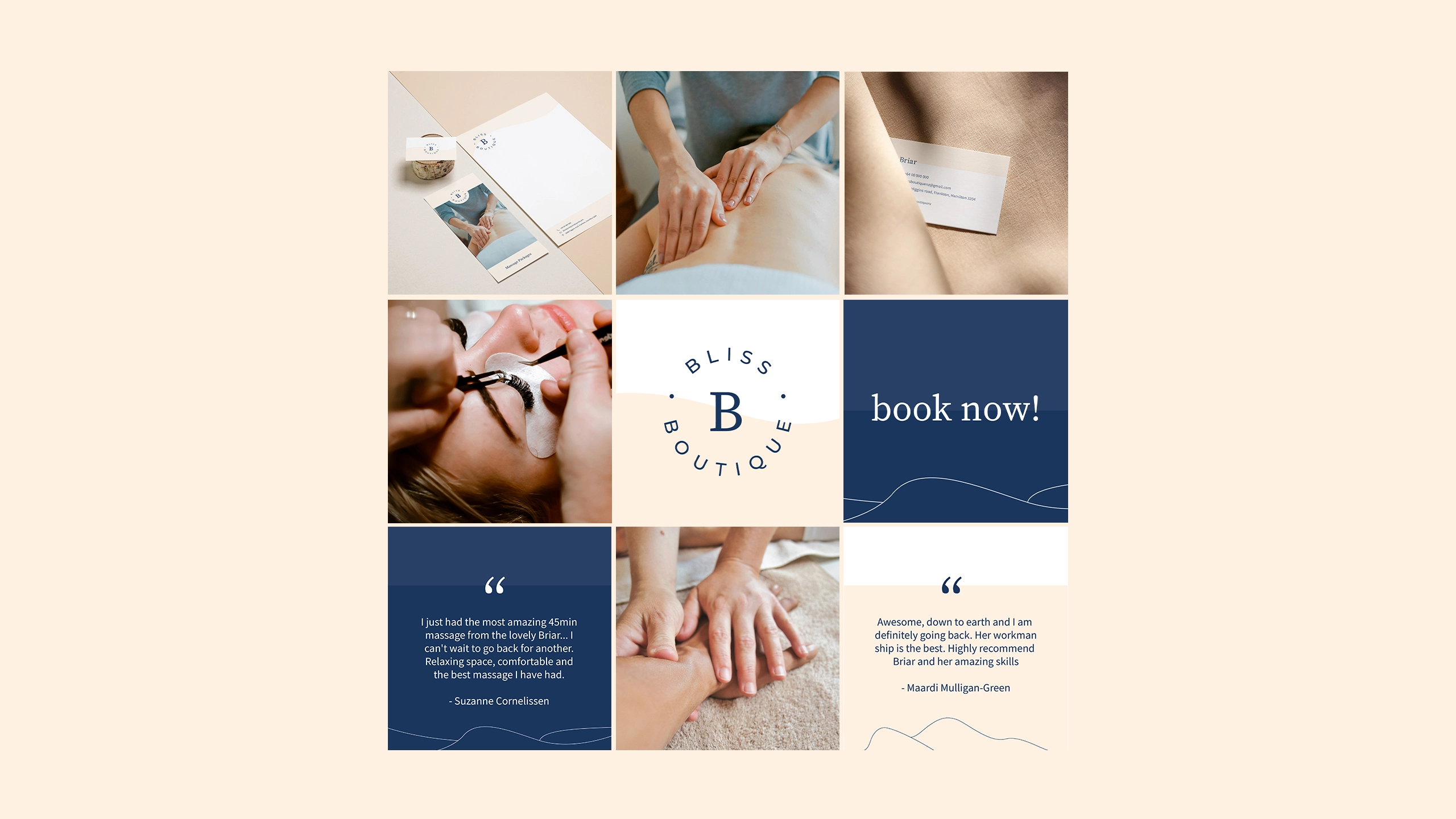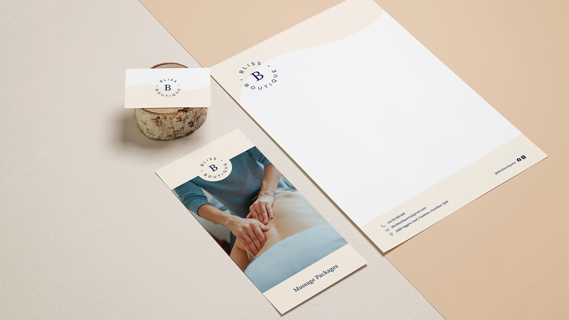 The new brand identity for Bliss was designed to evoke tranquility, warmth, and a sense of care. Inspired by natural beauty and holistic wellness, the neutral colour palette featured cream, warm peachy hues, crisp whites, and a navy blue for contrast where needed. The result was a soothing and timeless aesthetic.